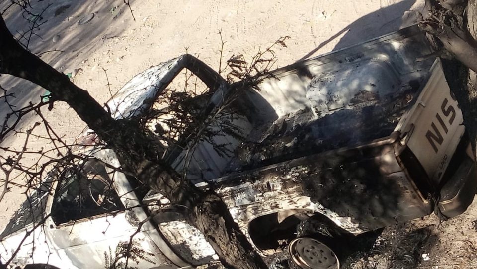 El cuerpo de un hombre fue encontrado calcinado, en la caja de una camioneta Nissan, en la comunicad de Escalerillas.