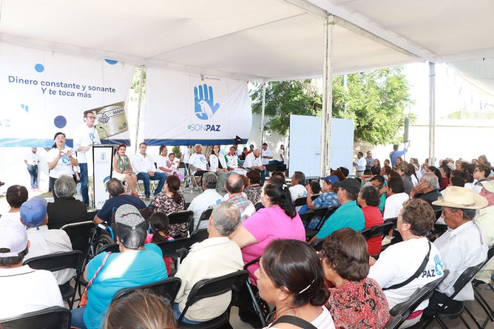 Al continuar con la entrega de tarjetas en las que cada bimestre recibirán jóvenes estudiantes, jefas de familia y adultos mayores, los apoyos sociales del programa “En Son de Paz”, el Presidente Municipal de San Luis Potosí Xavier Nava Palacios, precisó a habitantes de El Saucito que “desde el Gobierno de la ciudad queremos no solamente ayudar a familias vulnerables para solventar sus carencias, sino queremos también que sea un aliciente para nuestros jóvenes y niños en su estudio y por supuesto, que sirva de alivio a las necesidades de nuestros adultos mayores”.