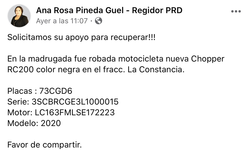 El día de ayer, la regidora Gallardista Ana Rosa Pineda Guel, publicó a través de su fan page de Facebook, un mensaje en donde solicitaba el apoyo de sus “seguidores” para localizar una Motocicleta “Nueva” Chopper, que le acababa de ser robada en la Colonia La Constancia, en Soledad de Graciano Sánchez.