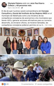 El día de ayer la Presidenta del Consejo Consultivo y Social del Instituto de las Mujeres, Olympia Palomo, denunció a través de su cuenta personal de Facebook, el desinterés que existe por parte del Presidente Municipal de Matehuala Alejandro Segovia, para atender los temas de Violencia de Género en el municipio.