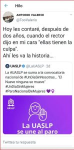 “La UASLP busca hacerse pasar como solidaria, pero tiene como cabeza a un machista”, aseguró desde su cuenta de Twitter el ex presidente de la Sociedad de Alumnos de la Facultad de Derecho, José Antonio Valerio Campos.