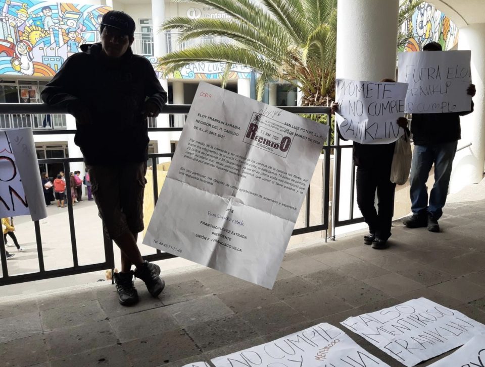 Con documentos en mano y pancartas a las afueras de la oficina de regidores, Francisco López Estrada, comentó que la solicitud consistía en Pintura, Cemento y Despensas, a las que previamente y de palabra se había comprometido Franklin Sarabia, solicitándoles realizarán esto por escrito, para entregarlo a la brevedad, situación que no ha ocurrido.