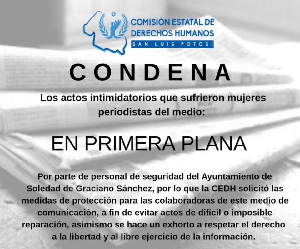 La Comisión Estatal de Derechos Humanos de San Luis Potosí condenó “Los actos intimidatorios que sufrieron mujeres periodistas por parte del equipo de seguridad (y de comunicación social) del alcalde Gilberto Hernandez Villafuerte”