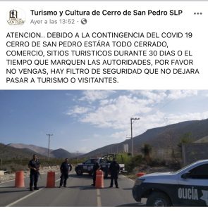 Rosaura Loredo, presidenta municipal de Cerro de San Pedro, prohibió literalmente y con elementos de seguridad armados la entrada a visitantes y turistas al municipio hasta que termine o se controle el CORONAVIRUS.