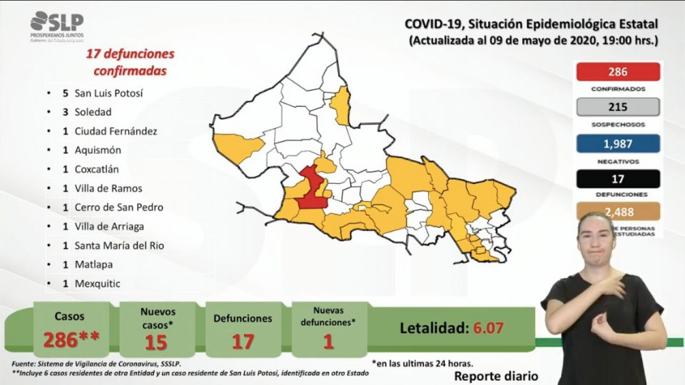 Este domingo 10 de mayo, día de las Madres, San Luis Potosí registra 15 nuevos casos positivos de COVID-19, por lo que el estado suma 286 casos y una defunción más, llegando ya a 17 muertos por esta pandemia.