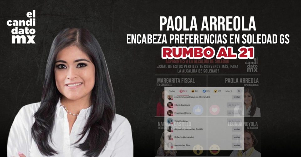 Estas 4 virtuales candidatas y sus porcentajes de preferencia fueron determinados a través de una encuesta publicada por este medio de comunicación en su Fan Page de Fb, El Candidato MX, en donde participaron 1270 Ciudadanos de Soledad GS, liderando las preferencias la Diputada Local por el V Distrito, Paola Alejandra Arreola Nieto, registrando un total de 523 votos a su favor; seguida de la Senadora Leonor Noyola con 441 votos; en la tercera posición la ex candidata a la Alcaldía Soledense, Margarita Hernández Fiscal con 179 reacciones y finalmente la Delegada de Interapas en Soledad de Graciano Sánchez, Natalia Castillo Vera con 127 puntos.