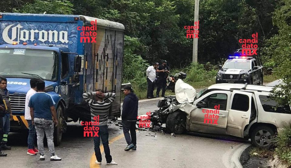 La camioneta tipo Suburban, color Champange quedó despedazada en su parte frontal al impactarse fuertemente contra un camión repartidor de cervezas.