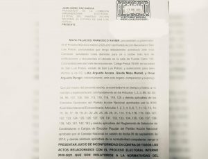 Trascendió que por la noche del miércoles, el equipo de trabajo de Xavier, presentó la impugnación. En el documento se da a conocer los señalamientos directos en contra de las acciones relacionadas con el proceso interno de elección llevado acabo el pasado domingo 10 de enero.
