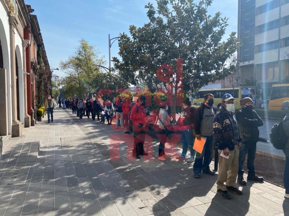 Derechohabientes del Infonavit en San Luis Potosí permanecen formados desde las 5 de la mañana al exterior de las oficinas ubicadas en avenida Venustiano Carranza en la zona centro, la larga fila llega hasta el cruce con Uresti.