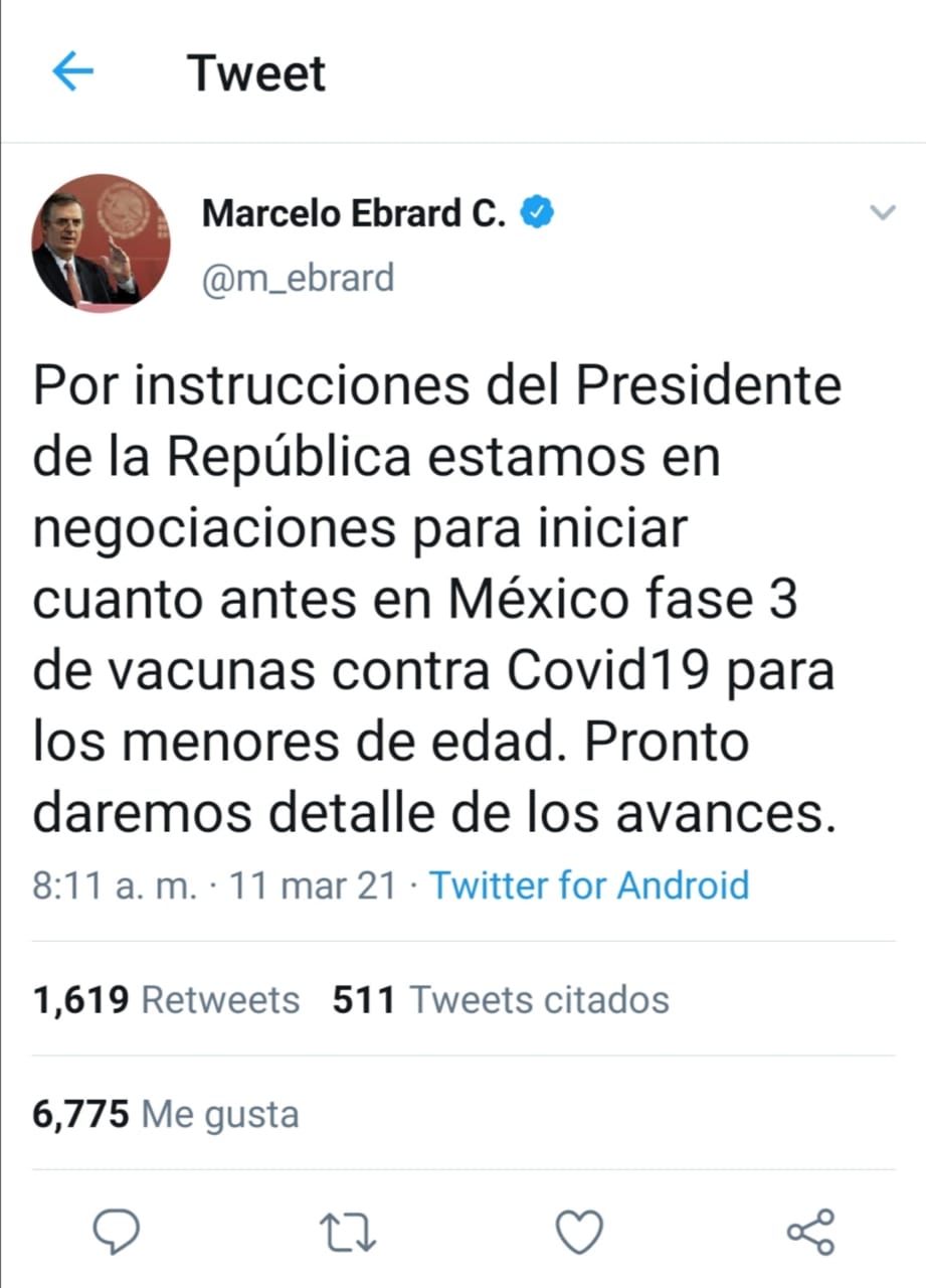 “Por instrucciones del Presidente de la República estamos en negociaciones para iniciar cuanto antes en México fase 3 de vacunas contra Covid19 para los menores de edad. Pronto daremos detalle de los avances” citó el canciller.