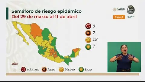 De éste modo, en verde aparecen siete estados: Coahuila, Tamaulipas, Veracruz, Jalisco y Nayarit, y se mantienen ahi desde la semana pasada también Chiapas y Campeche.