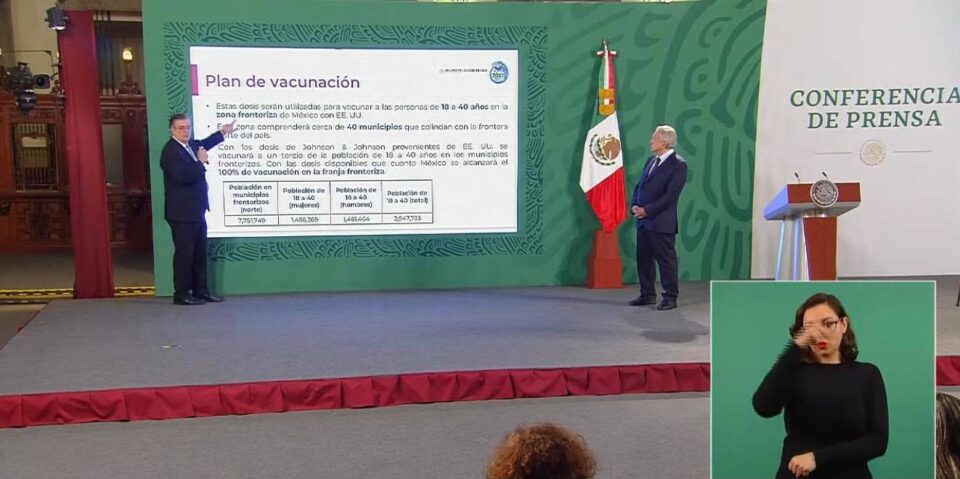 “Por instrucciones del señor Presidente estas dosis van a ser utilizadas para vacunar a las personas de 18 a 40 años en la zona fronteriza de México con los Estados Unidos. Esta zona comprenderá 39 municipios que son los que colindan con los Estados Unidos”, anunció el canciller mexicano en la conferencia matutina del presidente Andrés Manuel López Obrador.