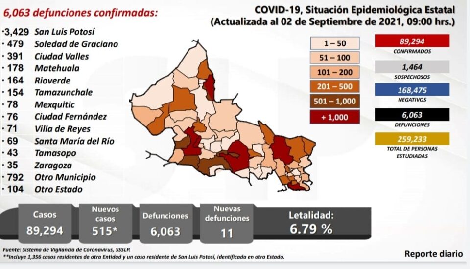 Este viernes se reportan 515 nuevos casos de covid-19 en las últimas 24 horas y 11 defunciones por la enfermedad.