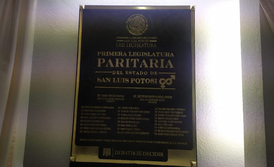 San Luis Potosí, SLP., 08 Septiembre de 2021.- Este miércoles fue develada una placa en las escalinatas del edificio del congreso local que se ubican en Jardín Hidalgo, la cuál reconoce a la LXII legislatura como la primera paritaria del estado o lo que es lo mismo, la primera conformada equitativamente por mujeres y hombres.