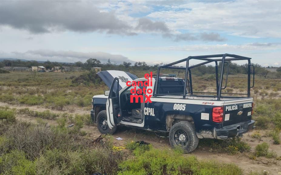 Horas después del reporte, sobre la carretera que conduce a Vanegas, a la altura de Las Norias, fue localizada la unidad policial abandonada, por lo que personal de la Servicios Periciales de la Vicefiscalía Científica realiza las diligencias respectivas.