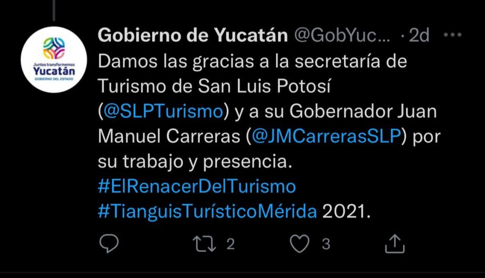 A través de un tweet publicado en redes sociales el gobierno de Yucatán agradeció Alex gobernador Juan Manuel Carreras López la presencia del Estado potosino en el tianguis turístico en su edición 2021.