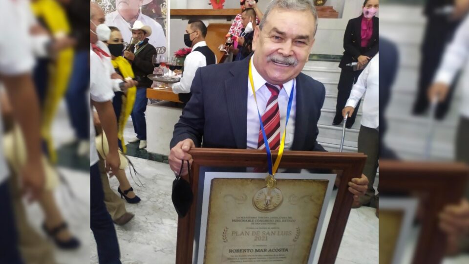 San Luis Potosí, SLP., 15 Diciembre 2021.- El congreso del estado de San Luis Potosí entrego este día la Presea al Mérito “Plan de San Luis” al profesor Roberto mar Acosta originario del municipio de Aquismón, quién por más de 30 años ha sido maestro de danza folklórica llevando la cultura Huasteca a diversos países en el mundo.
