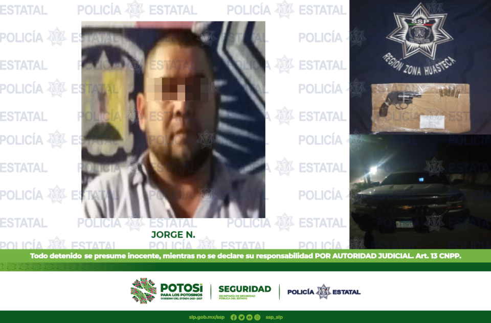 Otra de las detenciones fue en el municipio de Ciudad Valles, Policías Estatales patrullaban en la calle de Circo Purata en la colonia Cuauhtémoc, lugar en donde fue detenido Jorge N., de 42 años de edad a quien se le aseguró un arma de fuego tipo revólver con cinco cartuchos útiles, así como una camioneta color gris, marca Chevrolet, tipo Pick Up, modelo 2017, con placas de esta entidad.