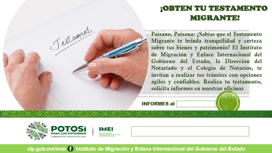 Y “Testamento Migrante”, se lleva a cabo en conjunto con el Colegio de Notarios Públicos, la dirección del Notariado y el IMEI, mismo que también puede tramitarse y solicitar la información respectiva en la oficina municipal de Enlace Municipal del Migrante.