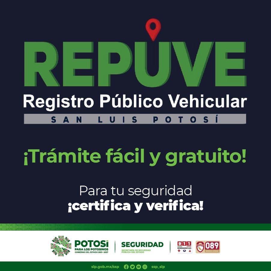 SAN LUIS POTOSÍ, S.L.P.- La Secretaría de Seguridad Pública del Estado a través del Registro Público Vehicular (REPUVE), informa a la población sobre los beneficios de inscribir a sus unidades automotoras para prevenir acciones que sean constitutivas del delito y proporcionar seguridad jurídica a los actos que se realicen con automóviles que circulan en el territorio nacional.