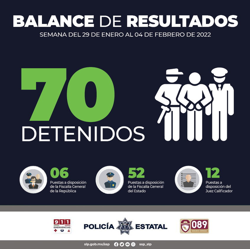 SAN LUIS POTOSI, S.L.P.- De acuerdo con un balance de resultados emitido por la Secretaría de Seguridad Pública del Estado, en el periodo comprendido del 29 de enero al 04 de Febrero del año en curso, en San Luis Potosí se registró la detención de un total de 70 personas, 6 de ellas quedaron a disposición de la Fiscalía General de la República; 52 ante la Fiscalía General del Estado y 12 más fueron presentadas ante el Juez Cívico Calificador por faltas administrativas.