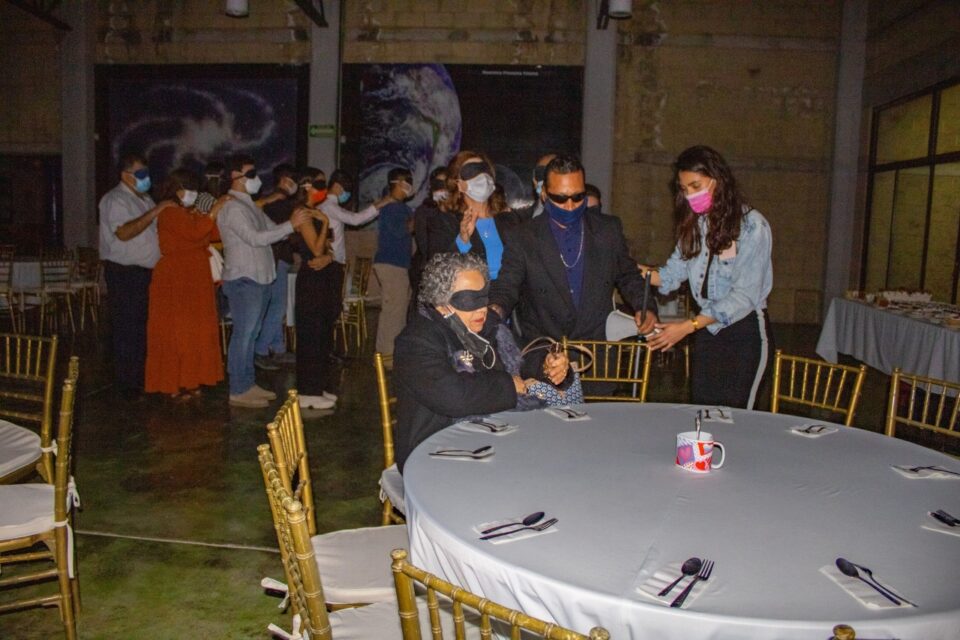 Cerca de 70 personas, entre funcionarios, maestros de educación especial y población en general, se dieron cita a las ocho de la noche en la entrada del museo El Colibrí donde para iniciar la actividad se colocaron un antifaz para quedar completamente a oscuras y posteriormente ser guiados por los diez meseros con discapacidad visual hasta sus mesas.
