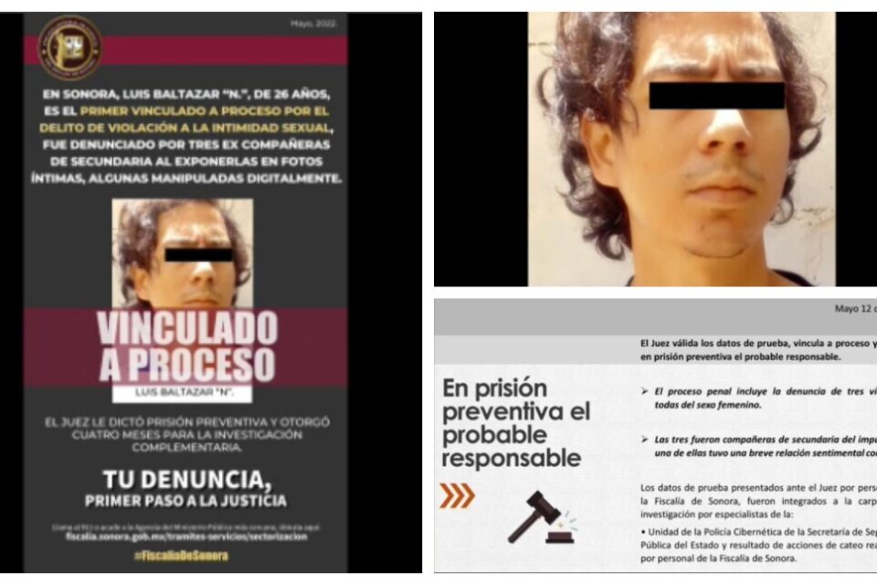 Las autoridades de Sonora, Hermosillo, dieron a conocer la detención de un sujeto identificado como Luis Baltazar, por el delito de violación a la intimidad sexual a tres mujeres que habían sido sus compañeras de secundaría. La policía dijo que el detenido difundía packs de mujeres en diversas páginas. La información señala que una de las victimas reconoció su foto en un sitio web, al percatarse de lo ocurrido dio parte a las autoridades.