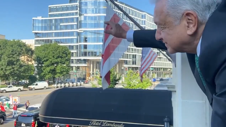 “¡AMOR CON AMOR SE PAGA!”: AMLO SALUDA A MIGRANTES DESDE LA VENTANA DEL HOTEL DONDE SE HOSPEDA EN WASHINGTON