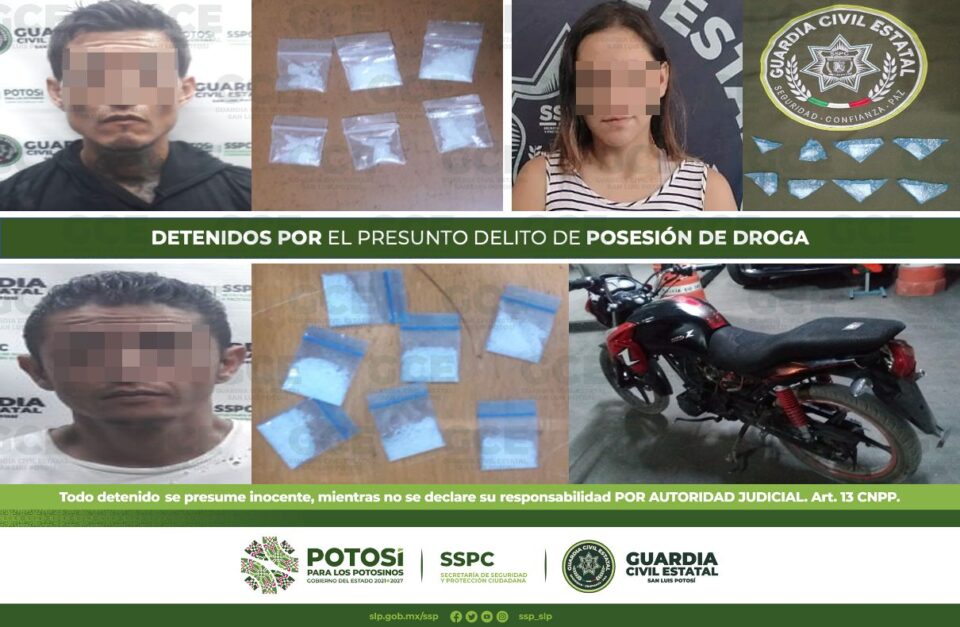 A su vez, en el Municipio de Ciudad Valles, elementos de la GCE detuvieron a María de 24 años de edad en la calle de San Vicente C. Salazar en la colonia El Porvenir. A la mujer se le aseguraron 8 dosis de “cristal”.