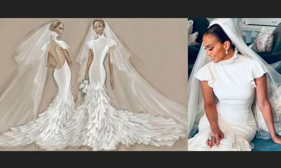 De acuerdo con la revista, se requirieron 30 artesanos especializados para bordar a mano el vestido de perlas de JLo, los adornos de cristal de Swarovski y otros elementos.