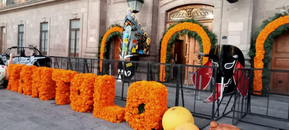 En Palacio de Gobierno fueron colocadas letras realizadas con flores de cempasúchil y un arco a la entrada del recinto, además de máscaras del Xantolo y se prepara en el interior un altar monumental flanqueado por dos coloridas catrinas.