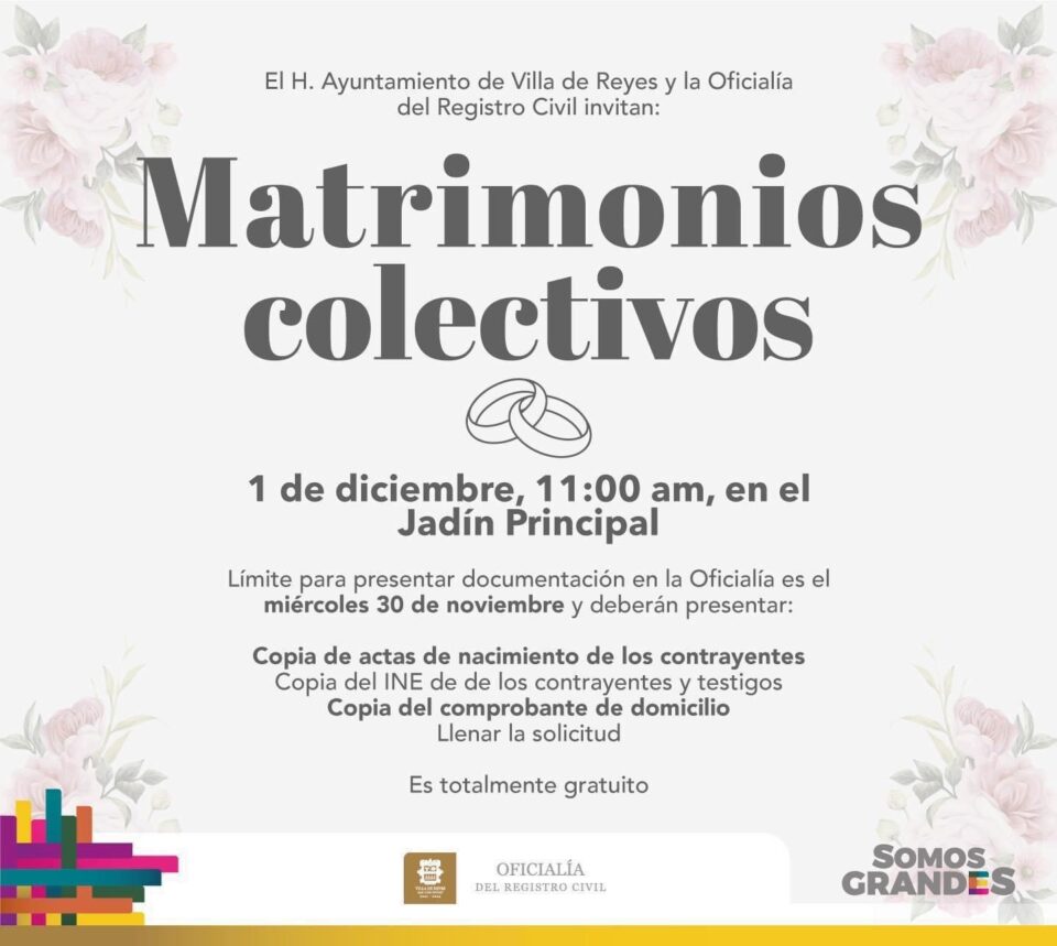 El H. Ayuntamiento de Villa de Reyes a través de la Oficialía del Registro Civil, llevará a cabo “Matrimonios Colectivos” en el jardín principal durante este jueves 1 de diciembre.