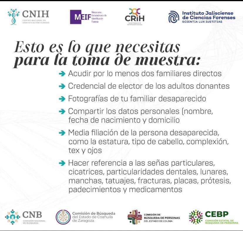 La Primera jornada de toma de muestras con enfoque masivo estará abierta a quienes tengan algún familiar desaparecido, y para formar parte de esta convocatoria no es necesario que exista una denuncia por desaparición y los requisitos que deben cubrir son: acudir al menos dos familiares directos; credencial de elector de los adultos donantes; fotografías del familiar desaparecido; proporcionar sus datos personales como nombre, fecha de nacimiento y domicilio; media filiación como estatura, tipo de cabello, complexión, tez y color de ojos; hacer referencia de señas particulares como cicatrices, lunares, manchas, tatuajes, fracturas, placas, prótesis o padecimientos.
