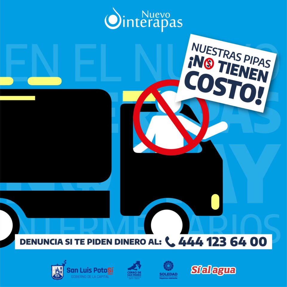 Por tal motivo, si algún usuario sorprende a operadores de camiones cisterna o personal del organismo solicitando algún cobro por la entrega de agua, puede reportarlo a la línea de atención de Acuatel 444 123 64 00.