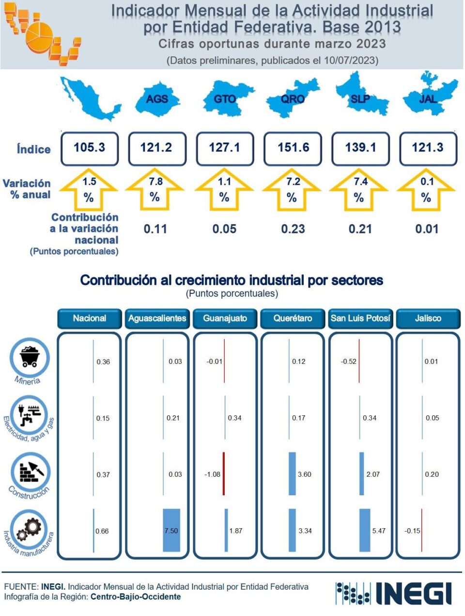 El titular de Sedeco mencionó que según el Indicador Mensual de la Actividad Industrial por Entidad Federativa. Base 2013 (Cifras oportunas durante marzo de 2023), publicado por el INEGI este 10 de julio de 2023, San Luis Potosí registró una variación anual de 7.4 por ciento superior al 1.5 por ciento nacional.