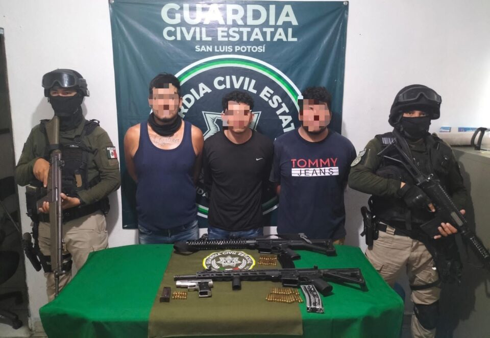 Como resultado de los trabajos de seguridad y vigilancia implementados en el dispositivo “Huasteca Segura”, efectivos de la Guardia Civil Estatal (GCE) detuvieron a tres presuntos criminales integrantes de una célula delincuencial, a quienes además les aseguraron armas de grueso calibre de uso exclusivo de las fuerzas del orden público.