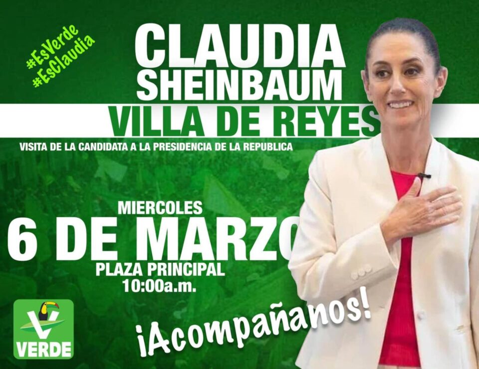 El municipio de Villa de Reyes se prepara para recibir a la doctora Claudia Sheinbaum, candidata a la presidencia de la República Mexicana, quien arribará hoy, 6 de marzo, a las 11:00 a.m. Este evento es representativo del Partido Verde Ecologista México, Partido del Trabajo, San Luis Potosí y Morena San Luis.