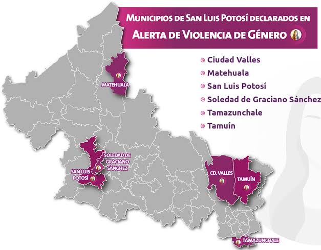 San Luis Potosí capital, Matehuala, Soledad de Graciano Sánchez, Ciudad Valles, Tamuín y Tamazunchale son las entidades que cuentan con este mecanismo debido a la cantidad de violencia de género que se ha presentado.