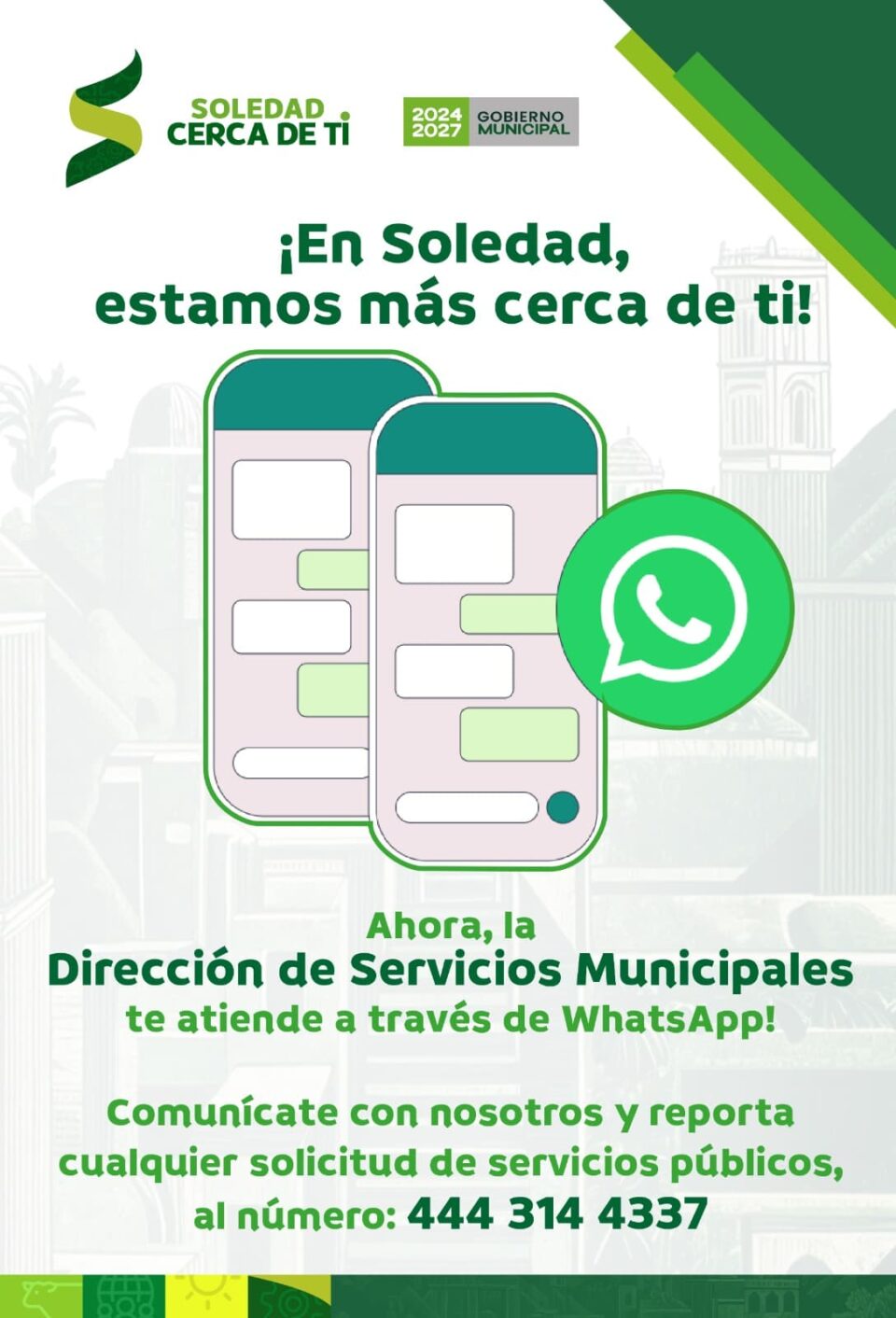 Para fortalecer la cercanía entre el Gobierno Municipal de Soledad de Graciano Sánchez y la población, garantizando una respuesta más rápida a sus necesidades, la Dirección de Servicios Municipales habilitó una nueva línea de WhatsApp, disponible en el número 444 314 4337, a través de la cual las y los ciudadanos podrán reportar incidencias relacionadas con alumbrado público, recolección de basura, poda de árboles y conocer sobre otros trámites de esta área municipal.