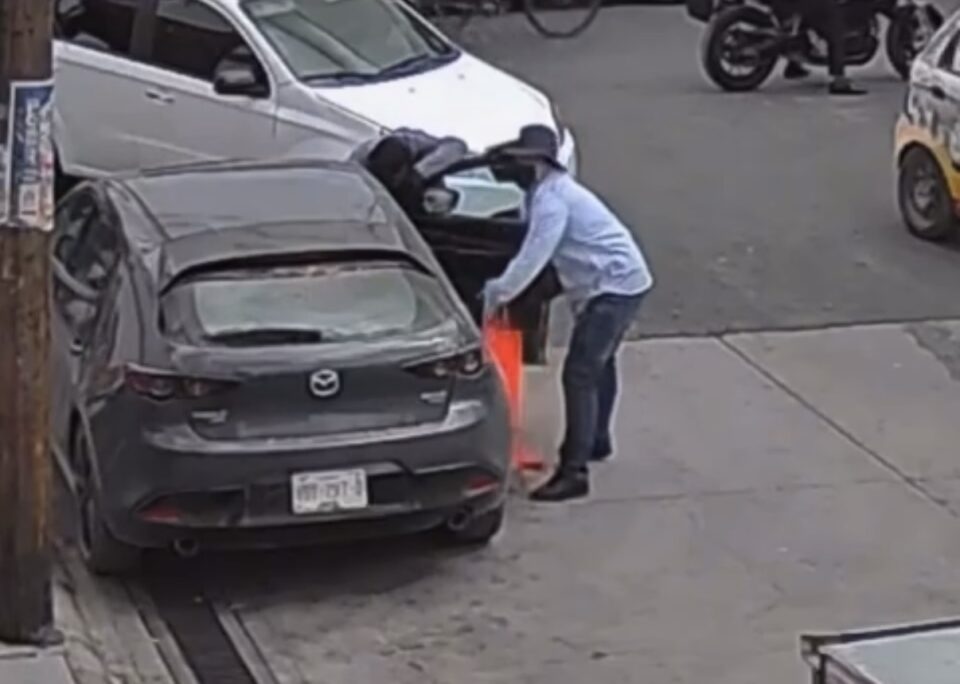 En las imágenes se observa cómo dos sujetos armados y disfrazados de vendedores en la central del abastos a bordo de un automóvil blanco interceptan a un hombre que estaba por ingresar a su vehículo, lo despojan de sus pertenencias y huyen del lugar.