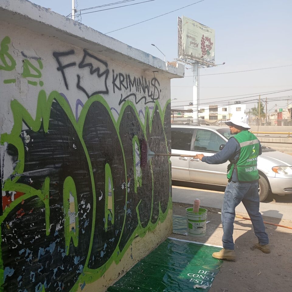 Como parte de estos esfuerzos de mantener entornos dignos para la población en general, se realizaron trabajos de mejoramiento visual con la aplicación de pintura en las fachadas de un salón de usos múltiples en la calle El Torno de la colonia Hogares Obreros, contribuyendo significativamente a la recuperación del espacio urbano y a la eliminación de grafitis.