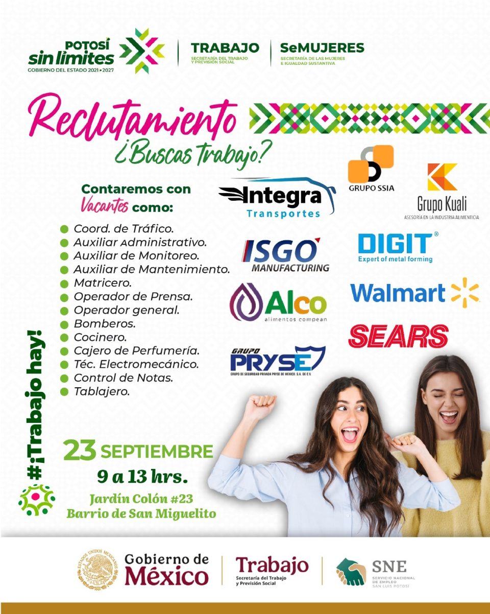 La Secretaría de las Mujeres e Igualdad Sustantiva (Semujeres), en coordinación con la Secretaría del Trabajo y Previsión Social (STPS) y el Servicio Nacional de Empleo (SNE), realizará la quinta Jornada de Reclutamiento Laboral el próximo martes 23 de septiembre en sus instalaciones ubicadas en Jardín Colón 23, barrio de San Miguelito, de 9:00 a 13:00 horas.
