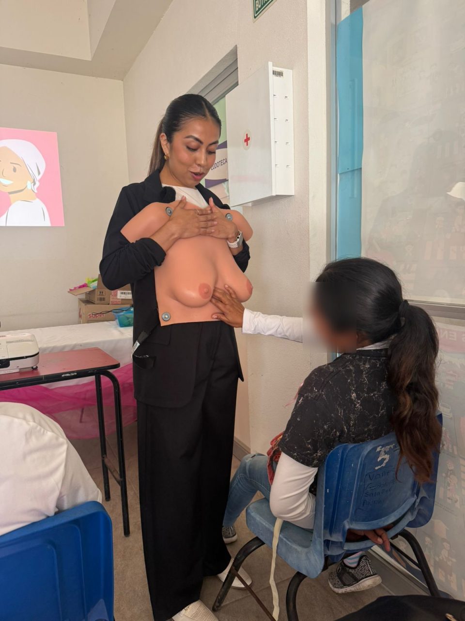 La actividad destacó la importancia de ver a la persona antes que al paciente, reconociendo la experiencia única de cada caso. Durante el evento se ofrecieron herramientas informativas y prácticas mediante un modelo anatómico de simulación, que permitió orientar a las asistentes sobre la técnica correcta de autoexploración, para identificar señales de alerta y acudir de manera temprana a los servicios de salud especializados.