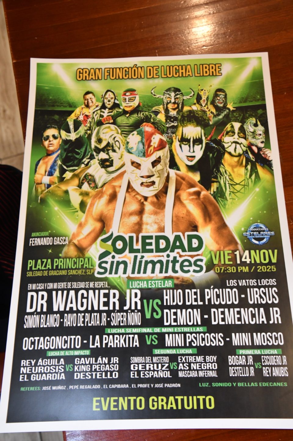 Las luces, la emoción y los gritos de la afición están listos para encender el corazón de Soledad de Graciano Sánchez, este viernes 14 de noviembre, cuando la Plaza principal se transforme en un verdadero cuadrilátero, donde la pasión luchística rugirá con la presencia estelar del Dr. Wagner en un espectáculo gratuito de lucha libre profesional que el Ayuntamiento, encabezado por el Alcalde Juan Manuel Navarro Muñiz, ofrece para el disfrute de todas las familias soledenses.