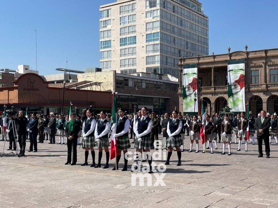 Bajo el asta monumental, el gobernador del estado, Ricardo Gallardo Cardona, y el alcalde capitalino, Enrique Galindo Ceballos, encabezaron la ceremonia acompañados por integrantes del gabinete estatal, autoridades educativas y personal del Ayuntamiento.