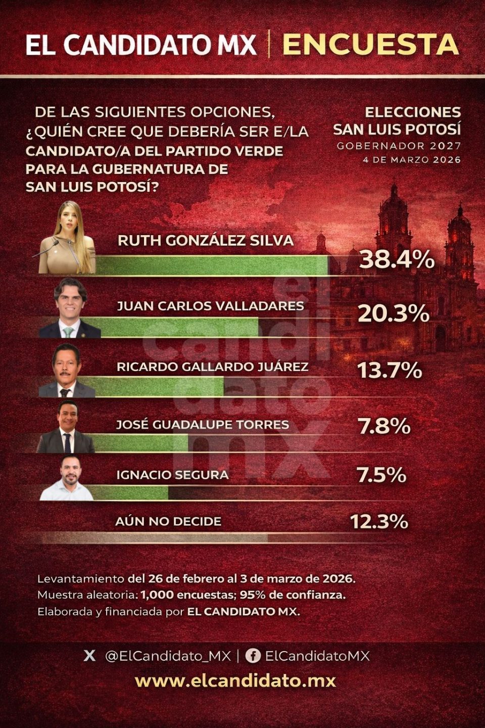 En El Candidato MX realizamos un ejercicio de medición para conocer la opinión ciudadana sobre quién debería ser el candidato o candidata del Partido Verde a la gubernatura de San Luis Potosí en 2027. Los resultados colocan a Ruth González Silva al frente de las preferencias con 38.4%.