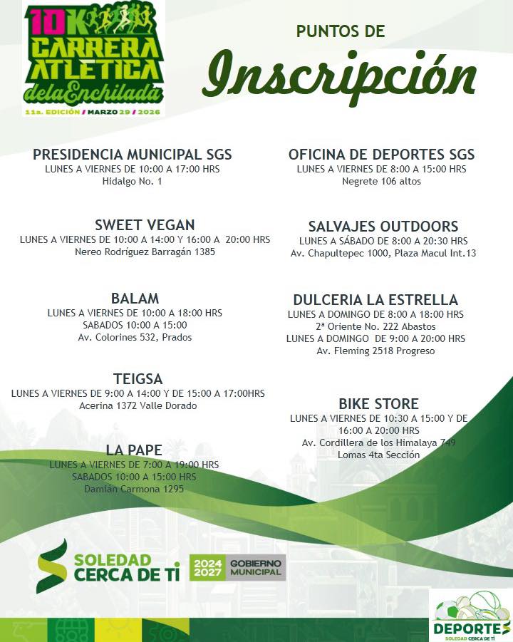 El Ayuntamiento de Soledad de Graciano Sánchez informó que ya se encuentran disponibles diversos puntos de inscripción para quienes deseen participar en la 11ª edición de la Carrera Atlética de la Enchilada, que se realizará el domingo 29 de marzo de 2026.