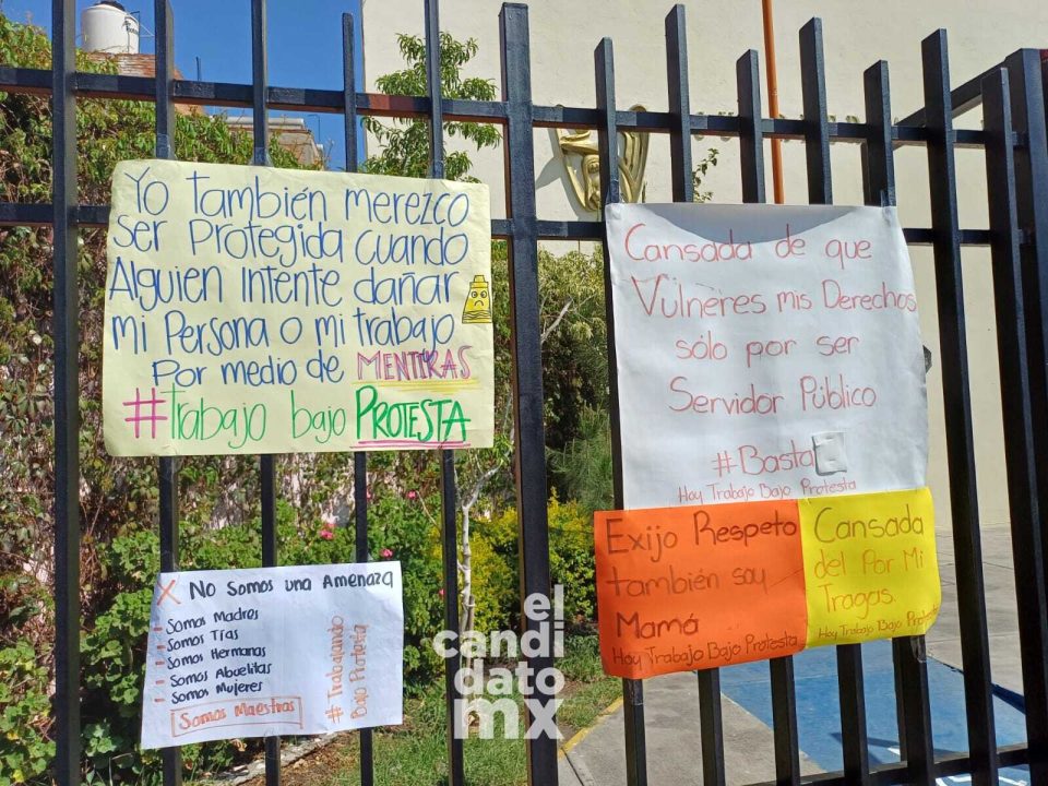 El inmueble, ubicado en la calle Manuel José Othón, cerca de la Alameda Juan Sarabia, amaneció con diversas cartulinas con consignas, en las que se exigían mejores condiciones de trabajo, respeto a su labor y justicia en el caso de una compañera.