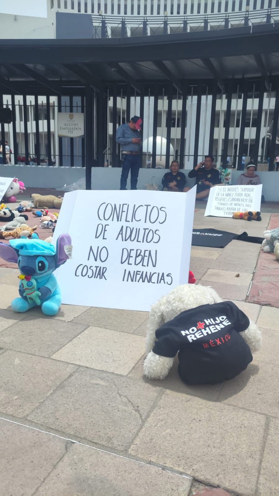 La asociación No Más Hijos Rehenes San Luis Potosí realizó una manifestación pacífica frente a la sede del Poder Judicial del Estado, donde colocaron decenas de peluches como símbolo de la ausencia de sus hijos y para visibilizar su situación.