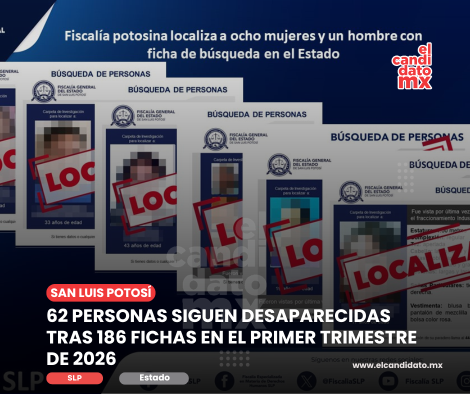 De acuerdo con la información recabada por El Candidato Mx, hasta el 31 de marzo a través de la página oficial de la Fiscalía General del Estado de San Luis Potosí (FGESLP) y las redes sociales de la Fiscalía Especializada en Materia de Derechos Humanos, el estado potosino ha publicado 186 fichas de búsqueda en los meses de enero, febrero y marzo de 2026.